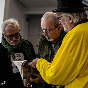 Spotkanie zaczęło się od wernisażu satyrycznych rysunków Henryka Cebuli – z udziałem autora i pod czujnym okiem prowadzącego Lecha Kotwicza. Wernisaż wpisywał się w wystawę „Cebula na wolnym ogniu”, którą w Książnicy można oglądać od 22 kwietnia do 11 maja. Rysunki działały jak dobra kreskówka w niedzielnej gazecie, tylko że tu człowiek nie przewraca strony, bo co chwila coś go zatrzymuje: raz trafna obserwacja, raz krótki żart, a raz to uczucie, że „to o nas, prawda?”.