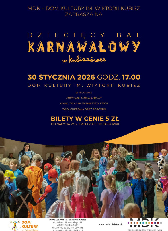 30 stycznia o godzinie 17:00 w Kubiszówka odbędzie się Dziecięcy Bal Karnawałowy skierowany do najmłodszych mieszkańców miasta. Wydarzenie zaplanowano w siedzibie placówki w Bielsko-Biała, a organizatorzy zapowiadają animacje taneczne, konkurs strojów oraz strefę ze słodkimi przekąskami. Liczba miejsc jest ograniczona, a udział w balu wymaga wcześniejszego zakupu biletu.