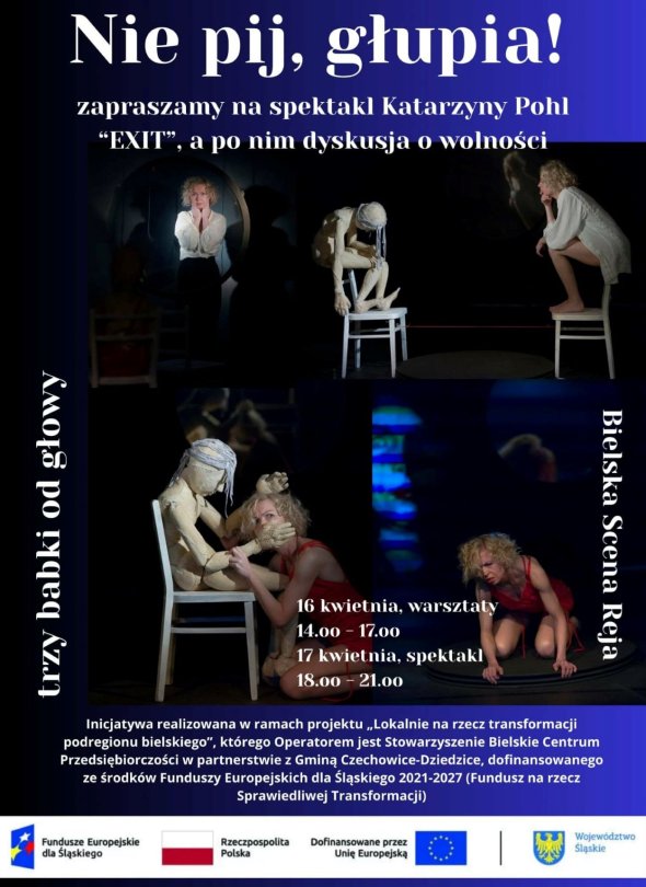 17 kwietnia o godz. 18.oo na spektakl Katarzyny Pohl "Exit. Wyjście ewakuacyjne" oraz zaraz po nim na panel dyskusyjny wokół tematu uzależnień.