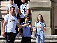 Inauguracja akcji "Rower pomaga" na bielskiej Starówce. W happeningu wzięli udział uczniowie klasy 2 Szkoły Podstawowej nr 3 w Bielsku-Białej.