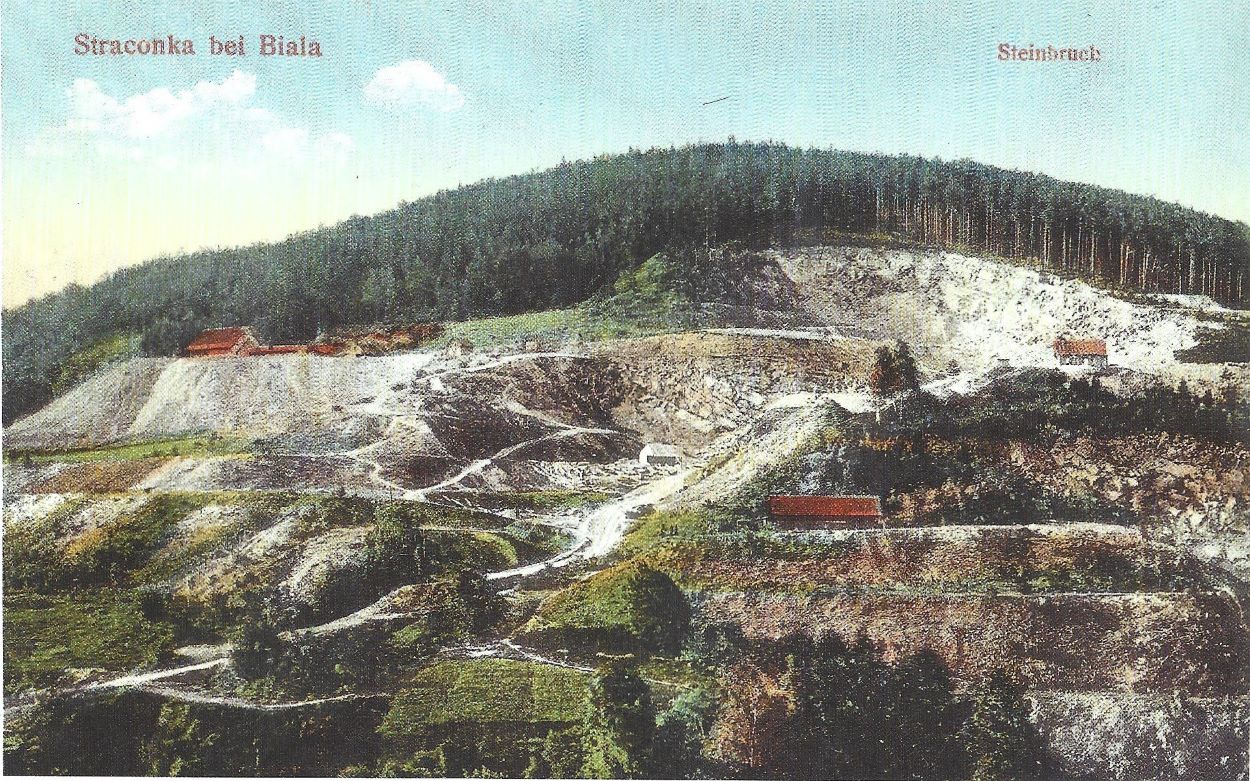 Kolorowana pocztówka przedstawiająca kamieniołomy w Straconce „Straconka bei Biala – Steinbruch”, ok. 1916 r. (autor: Adolf Brandstätter)